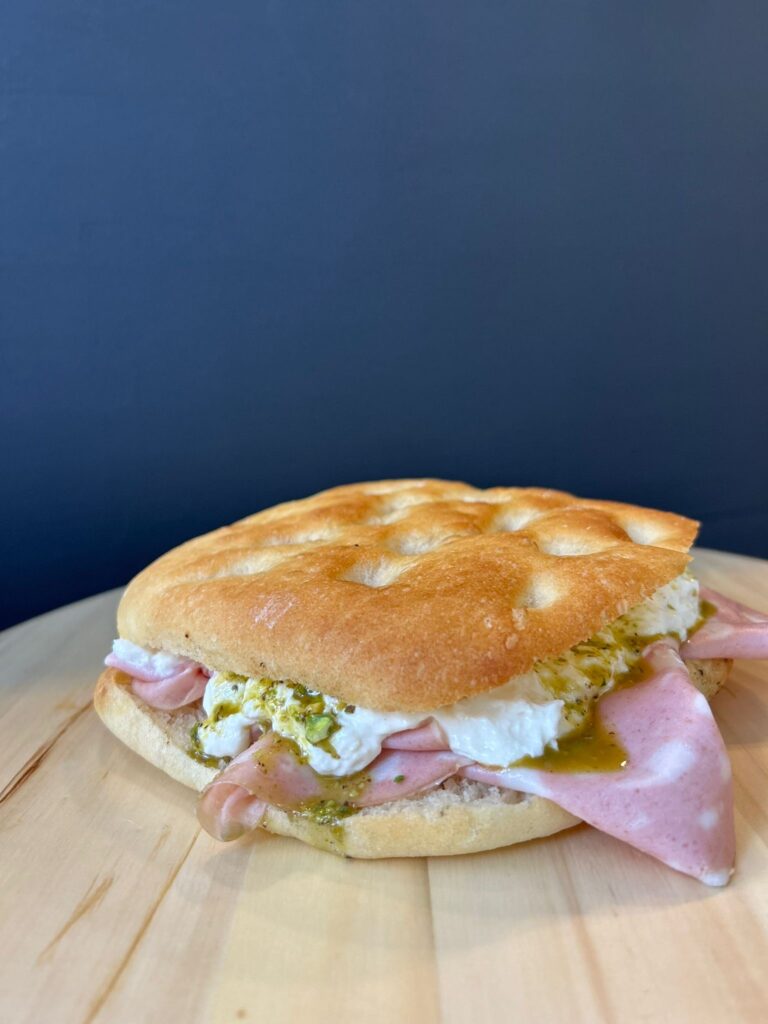 Mortadella, stracciatella, crema di pistacchio.